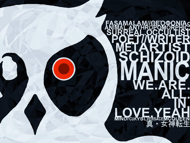 { Meta-artist*MindfcukYSLversacemCqUEEN }{ Schizoid-manic }{ WE ARE ALL IN LOVE, YEAH }