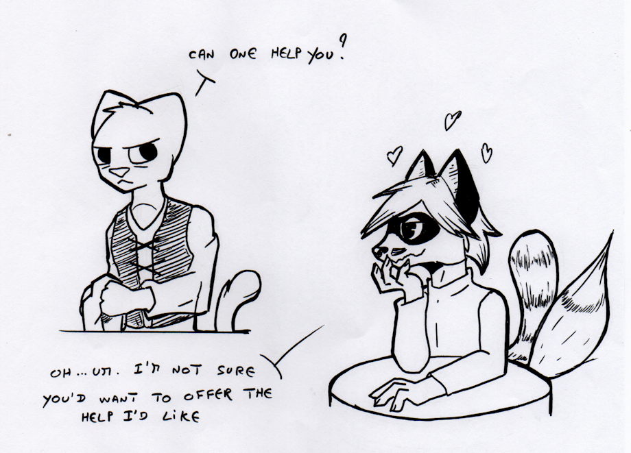 Kuroneko https://www.deviantart.com/kuronneko/gallery drew me the bartender from Prequel the webcomic by Kazerad www.prequeladventure.com Here he is at his bar grumpily asking if he can help me as I crush on him. I dont know if you want to offer the help I want Bartender. Maybe after closing we could discuss it in your room behind the bar?