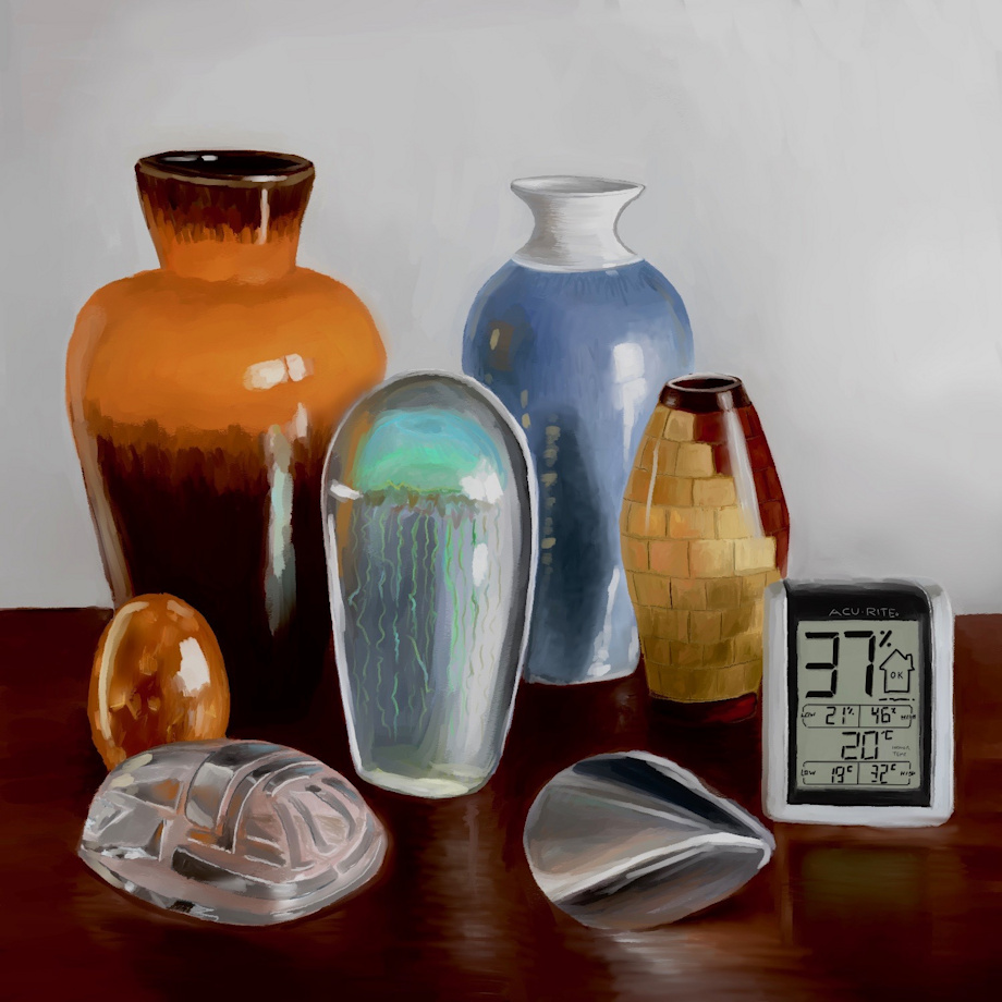 This pic is special. It's my first still life, and I wanted to get practice on various smooth glossy surfaces. But more importantly, the picture is a gift for my husband on his birthday. These objects are all important to us in some way, and the specific importance of them is known only to he and I. They are all brought to our home by him or me over the years, some very early in our relationship, and some quite recently. They range in cost from $2 yard sale finds to several hundred dollar art glass, but they are all priceless to us. Even in its way, the digital thermometer. This shelf of items tells a story that only we know.