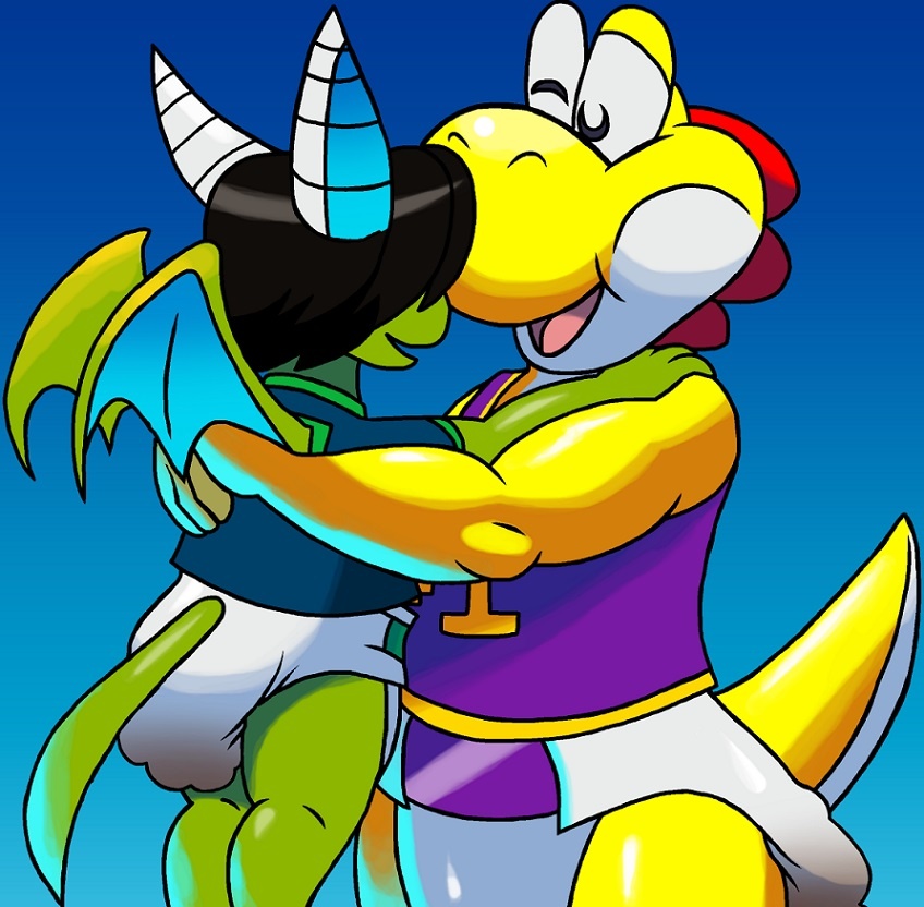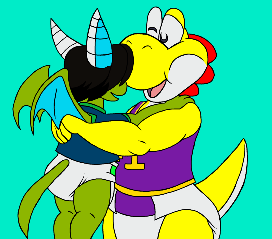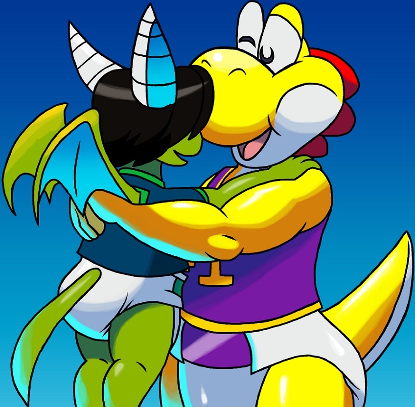 Showtime and Kay hugging each other. Both scalies are clean for one moment, and not so much the next.