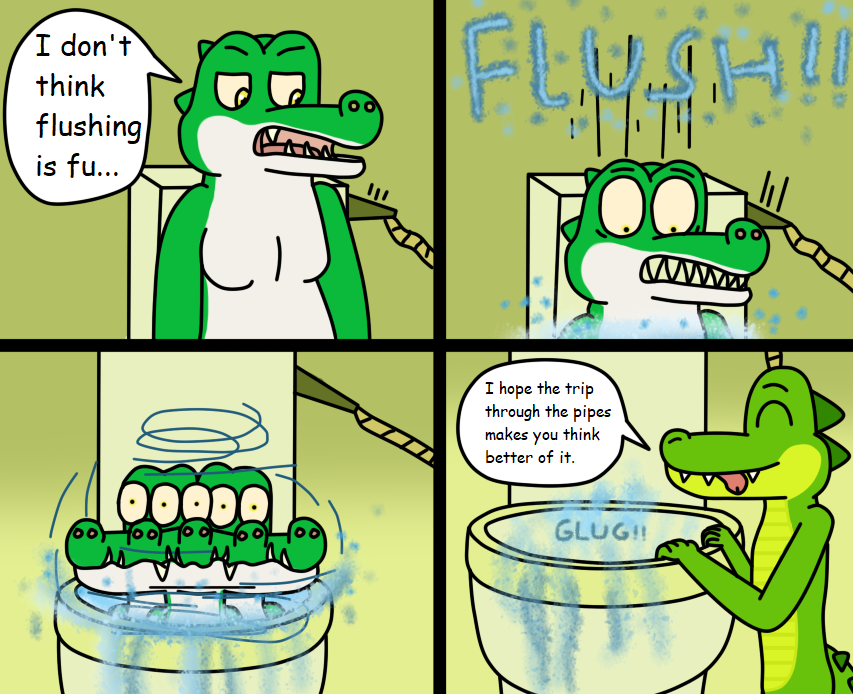 Cregon doubts that the flush is the fun, but surprisingly for him, the toilet flushes him, Croc, very happy tells him to enjoy the trip through the pipes.