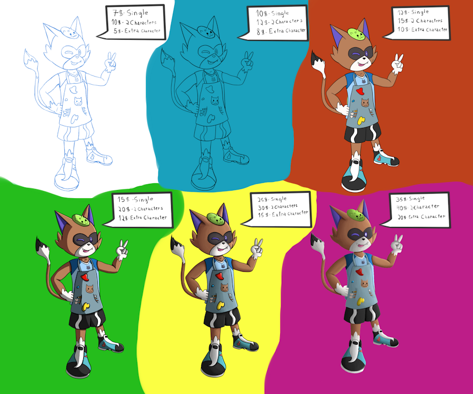 Art Sketch: 7$ Single, 10$ Two Characters, 5$ Extra Character Art Line Black: 10$ Single, 12$ Two Characters, 8$ Extra Character Art Color: 12$ Single. 15$ Two Characters, 10$ Extra Character Art Flat Shading: 15$ Single, 20$ Two Character, 12$ Extra Character Art Soft Shading: 25$ Single, 30$ Two Character, 15$ Extra Character Art NoLine Soft Shading: 35$ Single, 40$ Two Character, 20$ Extra Character