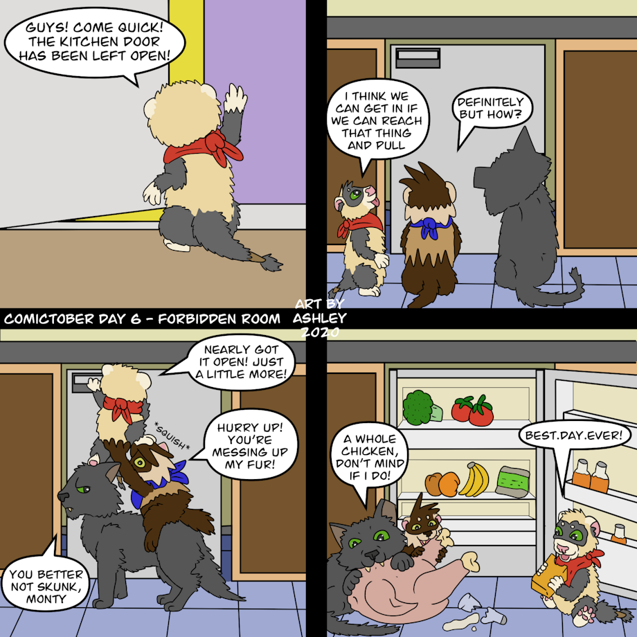 #comictober#comictober2020#inktober#inktober2020#ferret#ferrets#cat#cats#blackcat#mustelid#webcomic#comic#fridge#forbiddenroom#cheeseweezle#rawfed