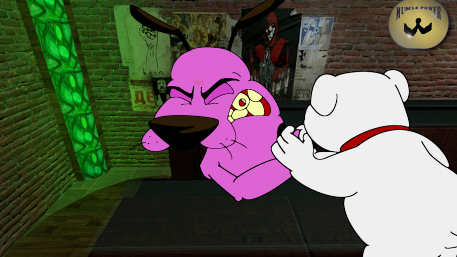 On Courage's night out, he meets up with Brian down at the local bar. And after a few drinks, they decided to partake in the ongoing arm wrestling match.