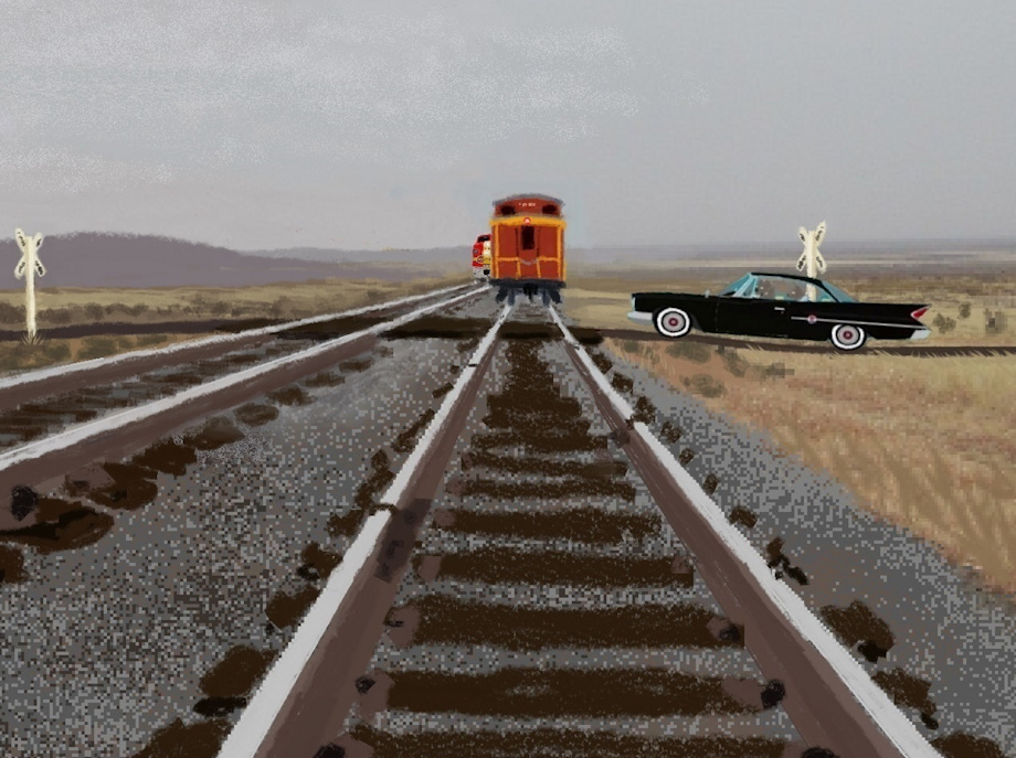 The Plymouth Fury station wagon with Rex driving wasn't far behind. However, Despite the Chrysler 300 being equipped with high performance steering and suspension for optimum handling, Clarence still had difficulty keeping the car straight and stable at 60 mph...Thus a car is no better than it's driver. Of course it was still a windy day, which could prove difficult for any new driver. Al grabbed the wheel, thus Clarence let go of the wheel and took his foot off the gas. "I don't think you're quite ready for 60 mph yet", Al said to Clarence as the Chrysler slowed down some. "I did get up to 60 though", Clarence proudly boasted. Once the Chrysler slowed down to 50 mph, Al gave control of the car back to Clarence and said to him, "Speed up gradually and see what you can handle". Clarence gradually increased speed until he reached 57 mph. That's when Clarence began experiencing difficulty keeping the car stable. "Back it down to 55", Al instructed Clarence. Upon Clarence doing so, everything was then okay. At no faster than 55 mph, Clarence could control the car just fine. Thus it was confirmed that the highest driving speed Clarence was comfortable with at that time was 55 mph. "Well, 55 isn't so bad", Clarence said. "You have been making improvements", Al assured Clarence. "Yea. Compared to a couple of hours ago", Jed remarked, which he, Al and Clarence laughed. Shortly before El Rito, Al had Clarence turn of on ISR 542. This time it was a right turn going north, on the opposite side of Route 66 then where they have been. Clarence drove north with Al and Jed on 542 as Rex followed driving the station wagon with Marge and Donna. Upon traveling a ways, they came to a place where Interstate 40 would someday pass over ISR 542. However, that part of I-40 had not yet been built at the time, thus there was no I-40 there. A few hundred feet beyond there was the crossing where the Santa Fe Railroad crossed ISR 542 as double tracks. "There's a freight train coming", Al said to Clarence as they approached the crossing. "Look to your left". The crossing only had two crossbucks with no lights, being it was a back road that crossed the tracks. However, Clarence did know to stop. "Push the neutral button", Al instructed Clarence after he had stopped. On the track nearest to them, an eastbound Santa Fe freight train traveling at 55 mph began going by. Shortly after the four locomotives went by, which were pulling a mile of freight cars, Al mentioned to Clarence, "I noticed I had to get your attention to that approaching train. You have to watch out for that at railroad crossings". "Yea, I guess I wasn't expecting a train coming", Clarence admitted as boxcars were rolling by. "The train you don't expect is the train that will getcha", Jed added. "That's right", Al affirmed, then told Clarence, "Wait up after this train goes by". The freight cars continued to roll by, with the wheels making that click-et-te-clack sound on the joints of the rails. There were mostly boxcars, several tank cars, and some flatbed cars carrying industrial cargo, all of which at 55 mph took a minute to go by. "Here comes the caboose", Jed mentioned. Immediately after the caboose rolled by, Clarence proclaimed, "Now I can go" as he pressed the drive button and stepped on the gas. "CLARENCE! STOP!", Jed shouted. Al quickly lunged his foot over the center console and slammed on the brakes just in time to stop from being struck by an 85 mph passenger train on the other track coming from the opposite direction.