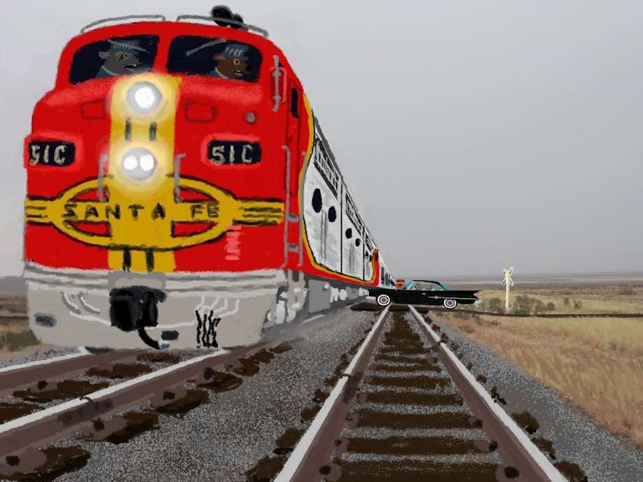 As Al held the brake petal down, the front end of the Chrysler was only two feet away from the Santa Fe passenger train as it continued speeding by at 85 mph...Hitting the brakes one second later would have made a life and death difference. Then finally, the last car sped by which was a rear observation car, thus the train was now past on by. That was a really scary experience for Al, Jed and Clarence, though there were no wet pants or wet car seats as a result. "That was the Super Chief we almost got hit by", Jed exclaimed as both trains could be seen at a distance going away. "I didn't know", Clarence said. "I didn't know there was another train". "You've just now learned about a mistake drivers often make at railroad crossings", Al told Clarence. "Don't get double crossed by double tracks". "Like I said. The train you don't expect is the train that will getcha", Jed reminded Clarence. Marge had gotten out of the Plymouth wagon and ran up to the Chrysler to see if Al, Jed and Clarence were okay. "Oh my God", Marge declared. "To think how close I came to becoming a widow with two cubs to raise". "Closer than you think. I believe we all saw our lives flashing before our eyes just then", Al replied as the Chrysler was still stopped over the tracks that the freight train had past by on. "Clarence, you need to use some common sense around railroads and crossings", Marge reprimanded Clarence. "You almost got your dad, your brother and yourself killed just now". "I'm sorry", Clarence apologized. "I had no idea another train was coming". "Remember I said, you follow instructions as your mother and I tell you", Al reminded Clarence. "Now you know why". "When we give you instructions, there's a good reason for it", Marge told Clarence. "I'm sure this experience is a wake up call for Clarence about trains and crossings", Al assured Marge. "I should certainly think so", Marge replied. Rex and Donna also went over to the Chrysler. "The old double cross by double tracks, isn't it?", Rex asked as he came walking over to the Chrysler. "It sure was", Al replied. "That's pulled a slide of paw on more animals than anyone realizes". "I'm glad you're all okay", Donna said in a shaky voice to Al and the two other cubs. Marge found this to be an appropriate time to remind the cubs, "You see what almost happened here. When a train goes by where there are two or more tracks, never assume there isn't another train coming". "That also goes for walking around railroad tracks too", Al further reminded the cubs. "That's right", Marge acknowledged. "I've seen cubs pull some real dillys before around the tracks that run through our neighborhood".