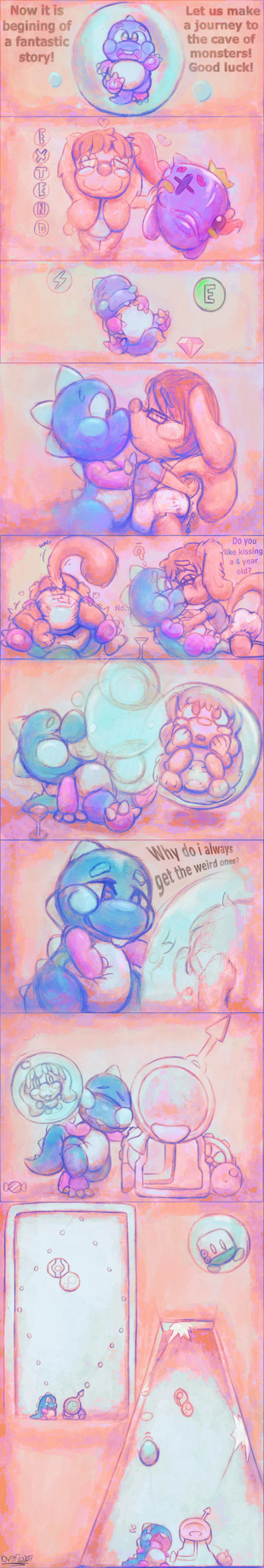 Reward for Everyone Why did I draw so many panels? XD I had no idea what I wanted to do with this character, all I know is every time I drew him in a diaper, it looked odd, due to his chibi design, so...I drew chibi adult Flo being a perv, getting his comeuppance, and then backfiring on Bob. Also I guess I just really wanted to burst Bob's bubble, ever since I was little. He's such a sexy bubble dragon, just begging to be popped. I also included lots of pointless references and items from the game, that no one will care about. ;>w<