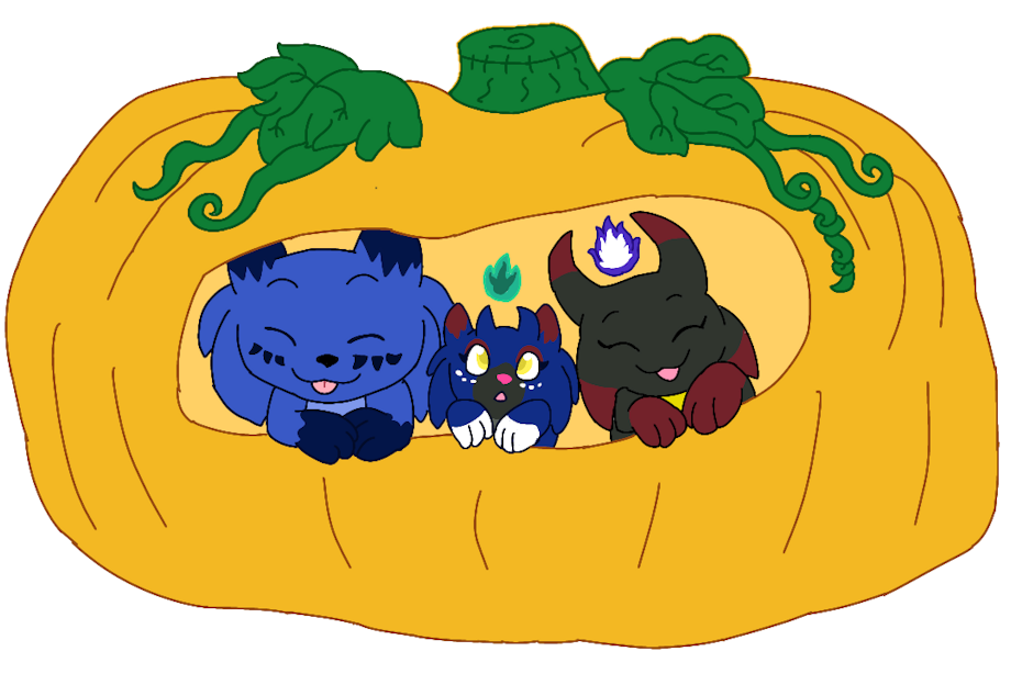 Three Chao in a plushie pumpkin pet bed.