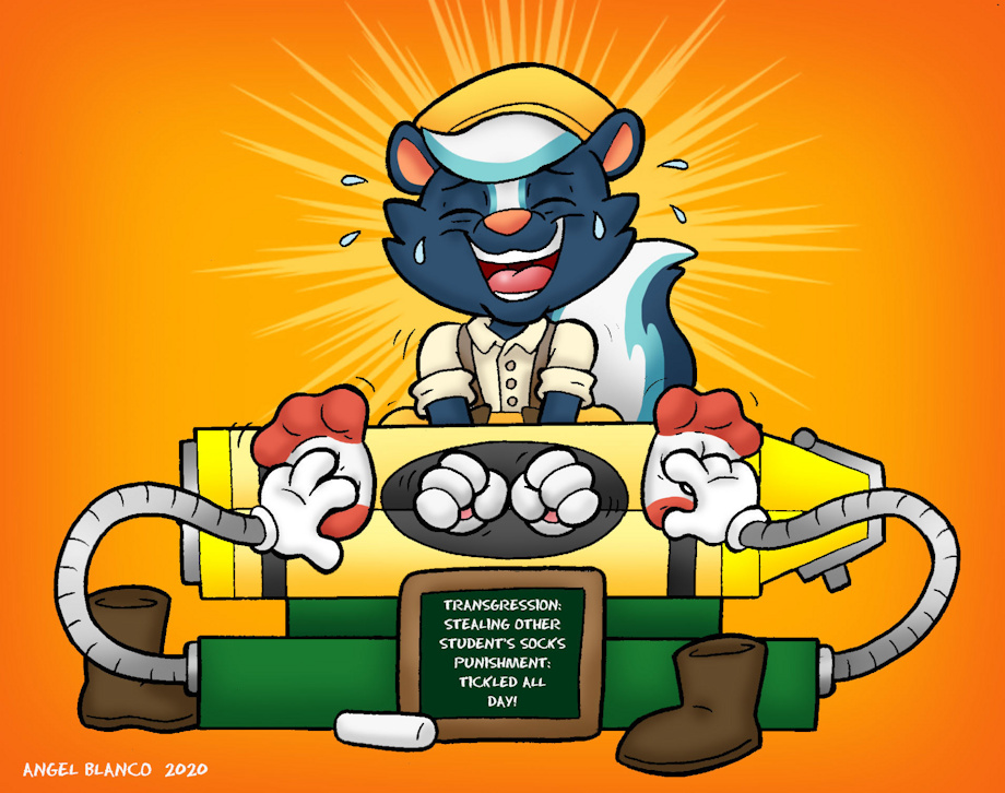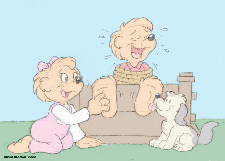 The Berenstain Bear siblings, Brother and Sister, decided to go to their town's Medieval Fair. And they came across a pair of old stocks for fun and photo ops. Sister dared Brother to get into them, and so Brother stuck his feet into the stocks, not wanting to be one upped by Sister. But it was all a ruse! Sister then playfully tied up Brother, and began tickling his feet, sending Brother into hysterical giggling! Lil Lady couldn't resist in joining the fun and giving Brother's feet a few ticklish licks!