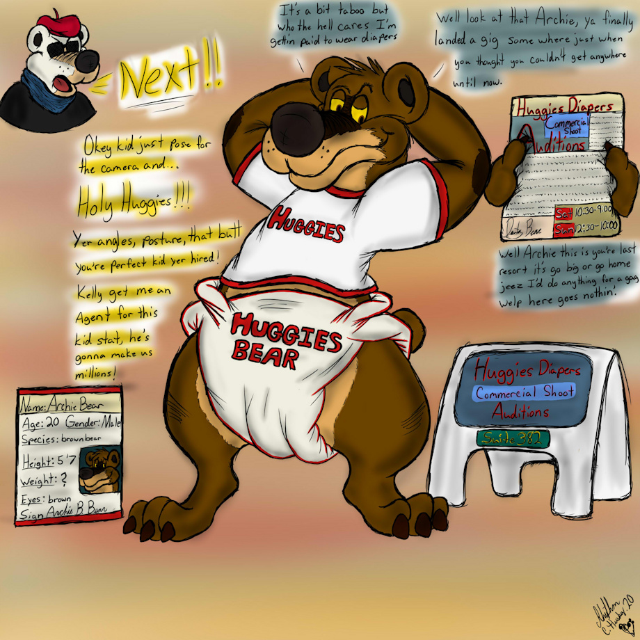 He thought he would get a gig in no time but having tried countless audition but with no luck, no one wanted him in any of their shows no matter how hard he tried. Archie was determined to get a gig in something, and that something came as Archie was walking to his Apartment he stumbled upon an Audition for the Huggies diaper commercial shoot at a nearby hotel and studio, Archie looked at the audition ad for Huggies and thought "There no way I'll get this, but what do I have to lose I gotta get a gig somewhere", after looking back at how many failed audition attempts he had was hesitant to even try such a thing but he was so dependent for a gig he'd do anything for one, even if it meant doing something strange, uneasy, and taboo.