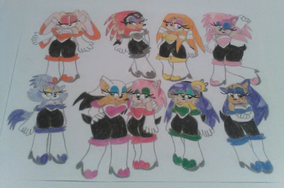 A remake of a pic I did quite a few years ago. Amy, Blaze, Mina, Shannon, older Cream, Shade, Tikal and Sonia wearing Rouge's outfit with their coloring.