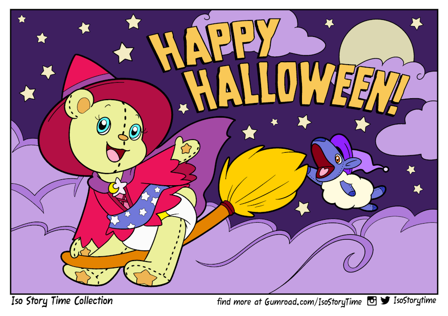 Here's Brianna, a cute and sweet little Teddy Witch Bear flying in the starry night sky on her broomstick with her clumsy but helpful partner and friend, Max a small stuffed wizard sheep.
