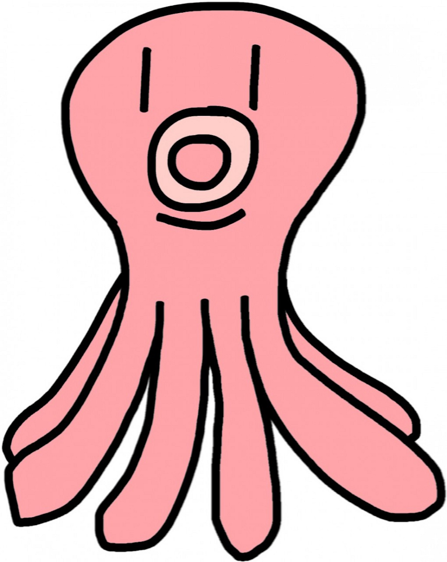 Pink body with lighter pink snout, black slit eyes, and eight tentacles.