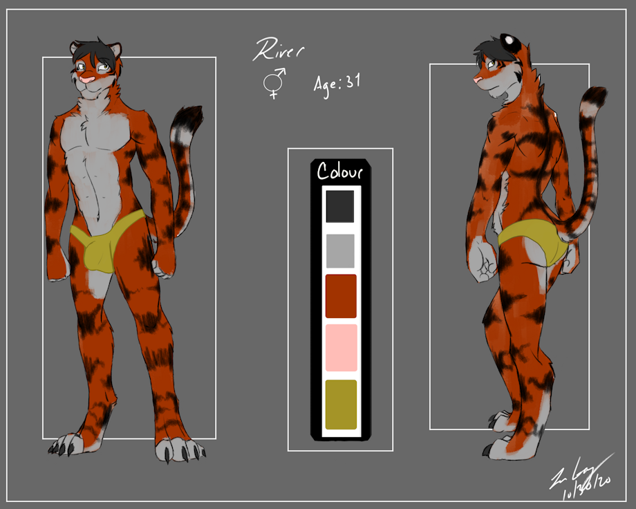 A muscular/toned tiger with golden red fur and black stripes. He has gold eyes.