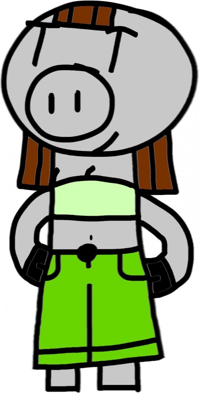 Melinda is a 17-Year Old Gray Pig who attends the same High School as Terry, Hattie and Gretchen. She and Terry are on the senior girls track and field team together. She likes exploring buildings and Bermuda shorts. She commonly appears as a background character. She is allergic to wool.