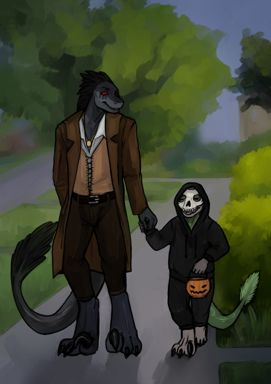 here is a picture of Ruslan taking her son Dervan out trick or treating (this was much earlier in her timeline when Dervan was still young, and he wanted to see what trick or treating was all about)