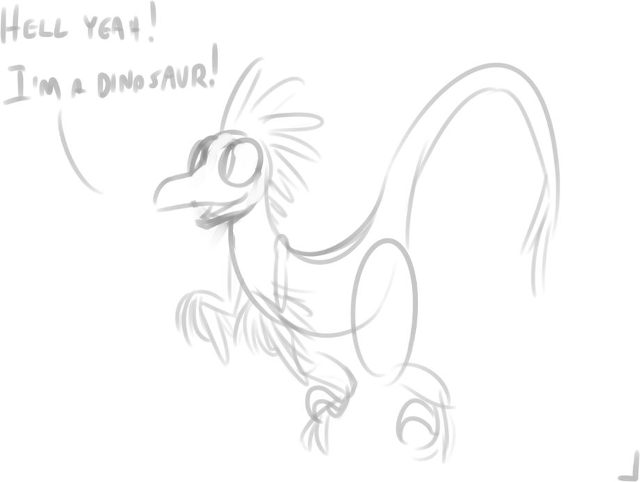 With that, the silver sphere vanished, immediately replaced by a small, bipedal, lizard-like creature with blue-green scales and tufts of bright red feathers on its head, arms, and the tip of its tail. “Hell yeah! I’m a dinosaur!”