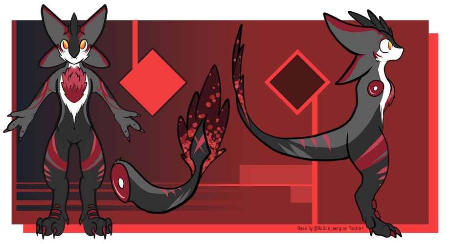 Talion is a 4' 5" male Avali with firey orange eyes. Main color of black with light grey, hidden wings to keep them from getting damaged. He has red details along his body in tribal like designs and a blood red feathered tail, white chest with red fluff and white along his neck and muzzle.