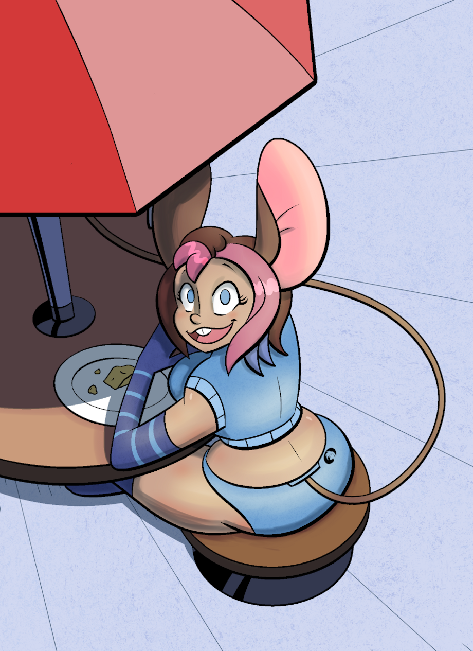 Some personal art. I wanted to draw more of my kemonomimi mouse girl that I turned into a while back alongside Erakir's own girl. Looks like she's having a nice lunch of cheese out on the town at an outdoor diner.