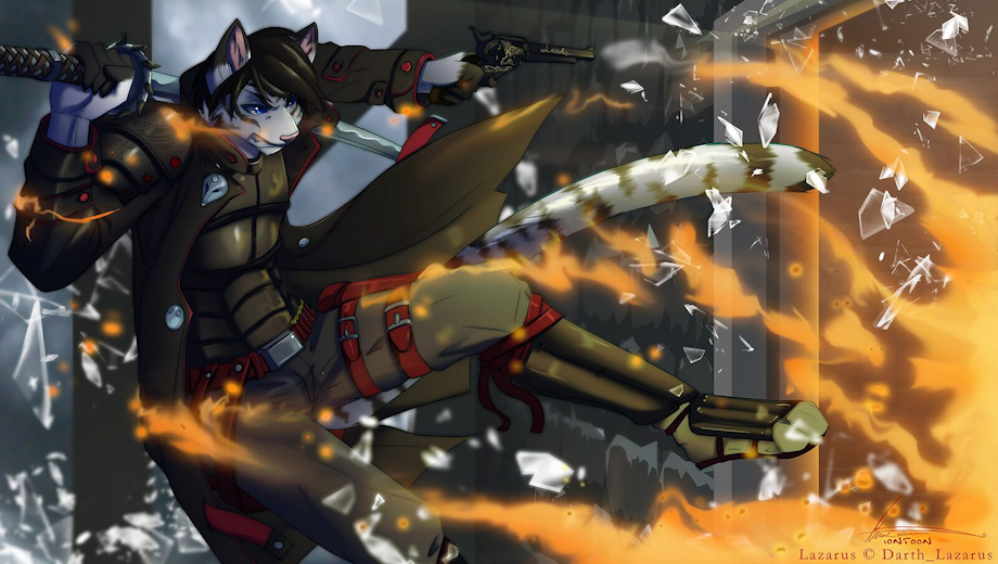 a commission drawn by IonToon i asked for an actionscene... i asked for my Katana and Colt... i asked for some very cool coat with armor and samurai bits... i gave him the freedom...
