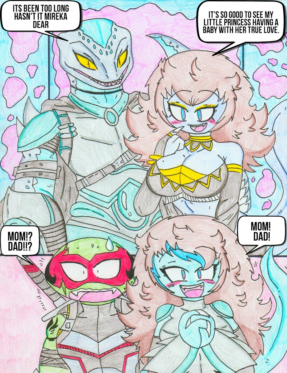 • With the News about Marc and Melissa's child on the way it was also heard across the stars all the way to the planet Sera, homeworld to the Salamandrians. As Marc and the others celebrate not only their victory but congratulating Marc being a father, during the celebrating a Salamandrian ship appeared to them unexpected. Within the ship were two Salamandrians as they are actually Melissa's parents coming to see their daughter. Turns out Melissa made a call to her parents about the news so they arrived to meet them. Marc being surprised as he has met them before in a time he and Melissa were just friends they were not surprised that Marc would be the father as they to see the relationship from the start. K'traka is Melissa's father and M'rona is Melissa's mother.