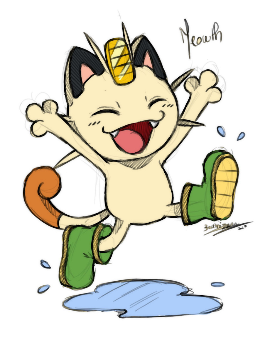 Meowth having some fun jumping in puddles with his little rain boots/wellies.