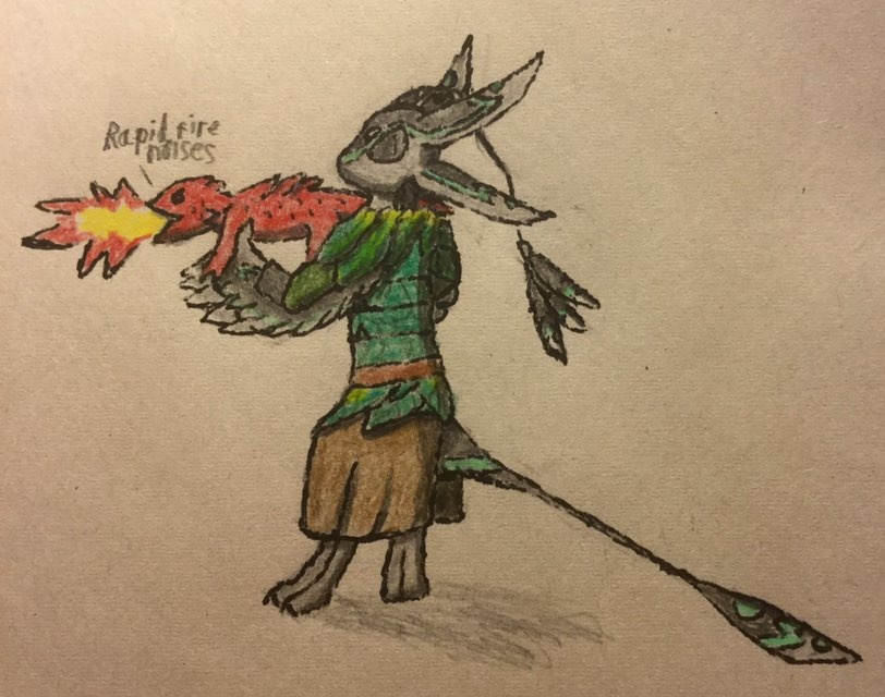 a bit of a silly runescape inspired drawing, of me wearing a the cabbagemancer outfit, shooting a red salamander like a crossbow.