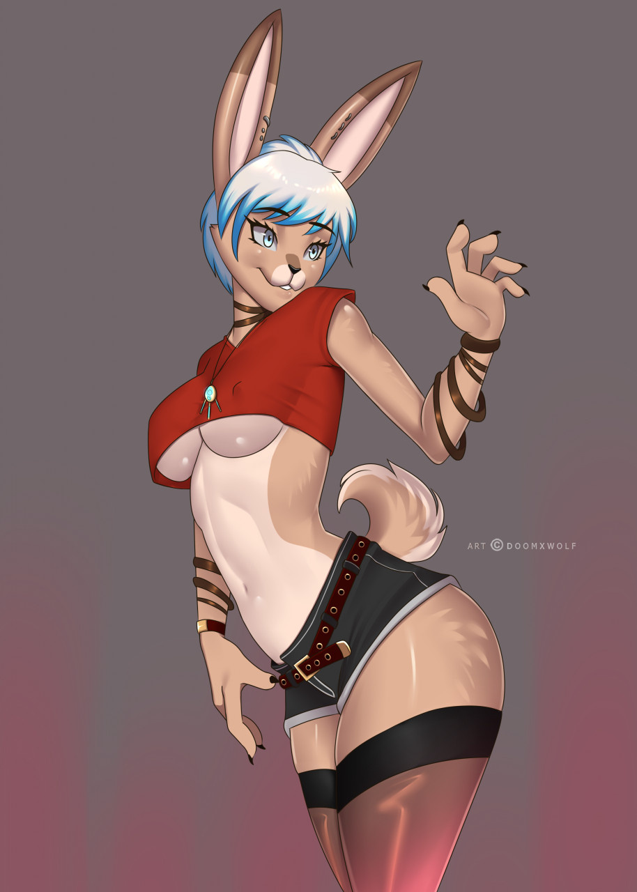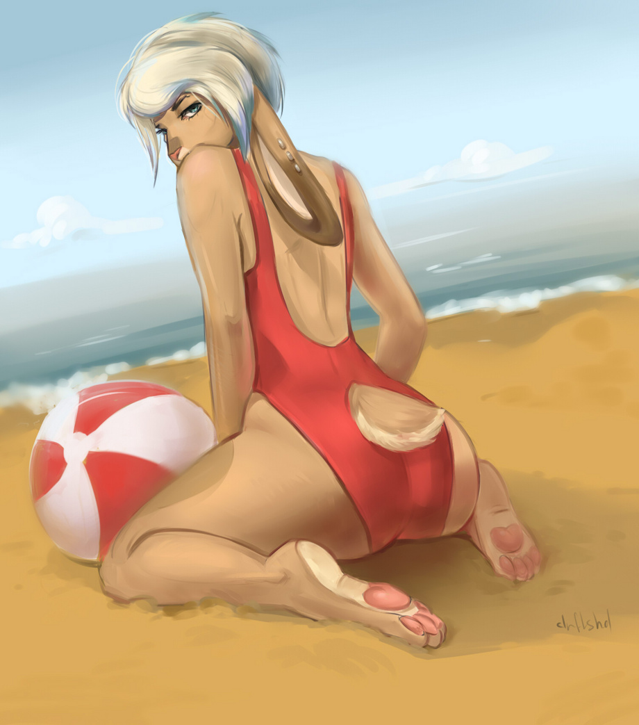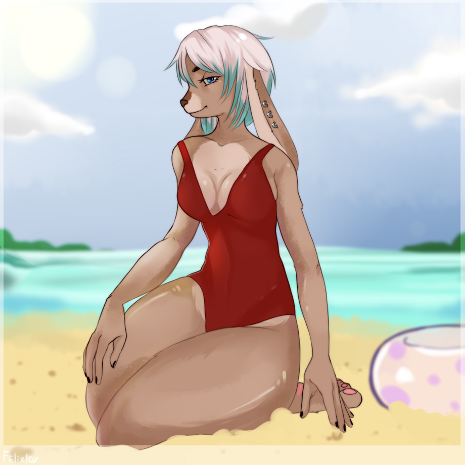 This is a cute one. I like her body here, especially her legs. So thick and juicy! :D Jackie enjoys the beach, it's just something she'd fancy. Blue skies, clear water, fresh ocean air, the freedom to sit and relax in the warm sun. It's a bit flirtatious too with that strap being a little off balance... Art by Felixlox on FA