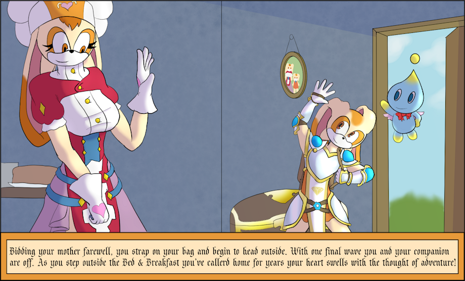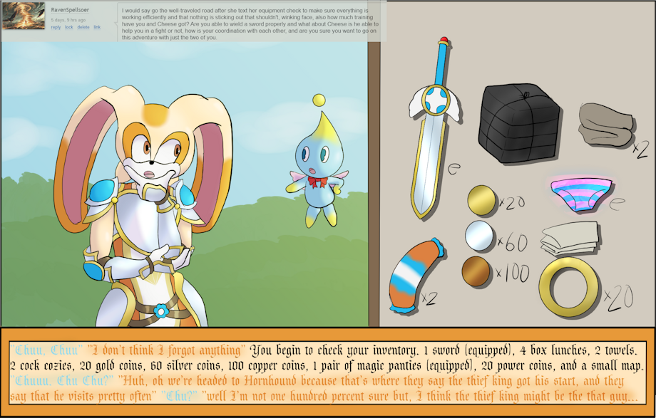 ~"Chuu, Chuu" "I don't think I forgot anything" You begin to check your inventory. 1 sword (equipped), 4 box lunches, 2 towels. 2 cock cozies, 20 gold coins, 60 silver coins, 100 copper coins, 1 pair of magic panties (equipped), 20 power coins, and a small map. "Chuuu. Chu Chu?" "Huh, oh we're headed to Hornhound because that's where they say the thief king got his start, and they say that he visits pretty often" "Chu?" "well I'm not one hundred percent sure but, I think the thief king might be the that guy...~