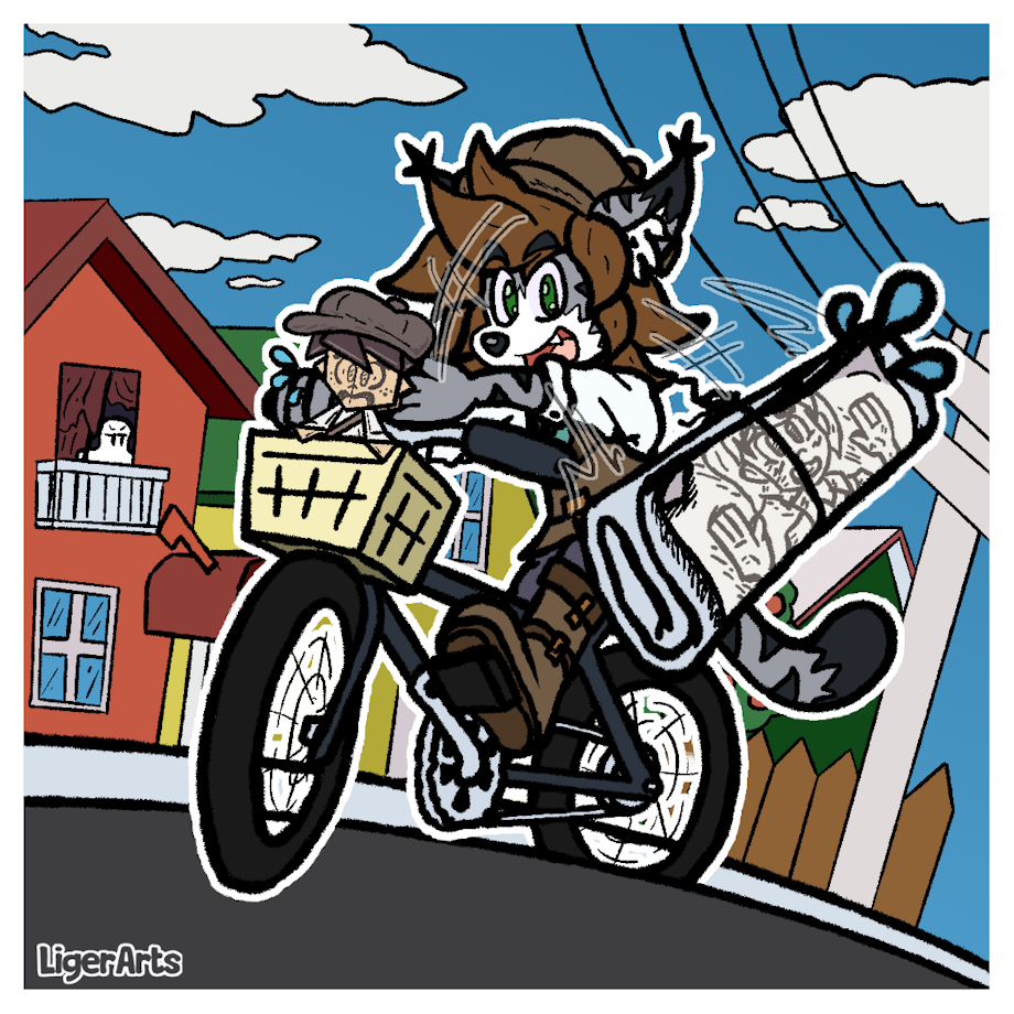Welp... Here, helping the boys with the newspaper delivery~... Although they gave Liger the appropriate clothes, it seems that he decided to do it like an Retro videogame~
