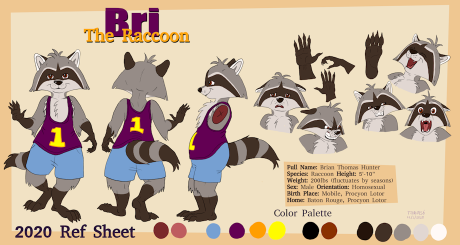 Here is the Clothed version of the 2020 ref sheet of Bri the Raccoon. Unlike his junior high school age 2014 iteration, Bri is now a full on adult of 28 years of age. Even though Bri is still every bit the mischievous raccoon he is. I wanted to tame that side of him with a bit of wisdom and maturity instilled into his character by trials and tribulations. Read his back story located at https://www.furaffinity.net/view/39540333/ for details. But suffice to say, he came to terms with inner feelings, suffered the tragic death of a life long friend, and endured trials that called upon every once of raccoon stamina and durability to keep himself together. But all in all in the end Bri turned out to be a fun loving down to earth raccoon with allot of irresistible Southern charm.