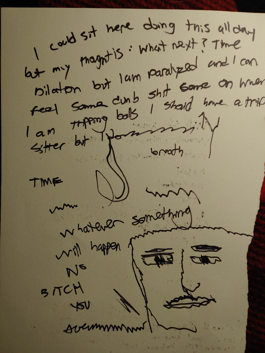 19. i could sit here doing this all day but my thought is: what next? Time Dilation but I am paralyzed and I can feel some dumb shit come on when i am tripping balls i should have a trip sitter but i donnnnnnt // breath // time // whatever something will happen // no bitch you