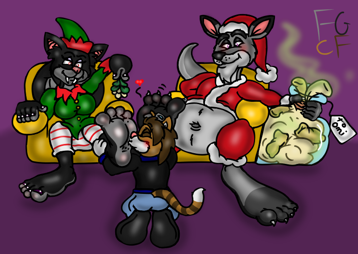 Seems as though someones been a good Kitty this year hehe anyways fun little christmas commission i did for https://www.furaffinity.net/user/djomnifusion featuring his Kitty getting some sole kissing from my Bat gal Patricia N my Big Roo Robert (who i rarely dont draw often) Hehe enjoy^^
