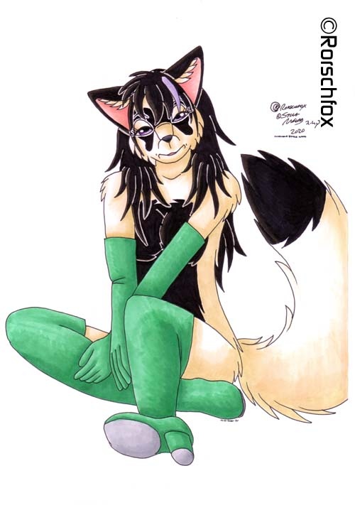 Raquel "Rorschene" Lightfoot, a cute Rorschach fox fem, playfully posing in a pair of long emerald gloves and matchings boots - and nothing else! She's naked, but modest.