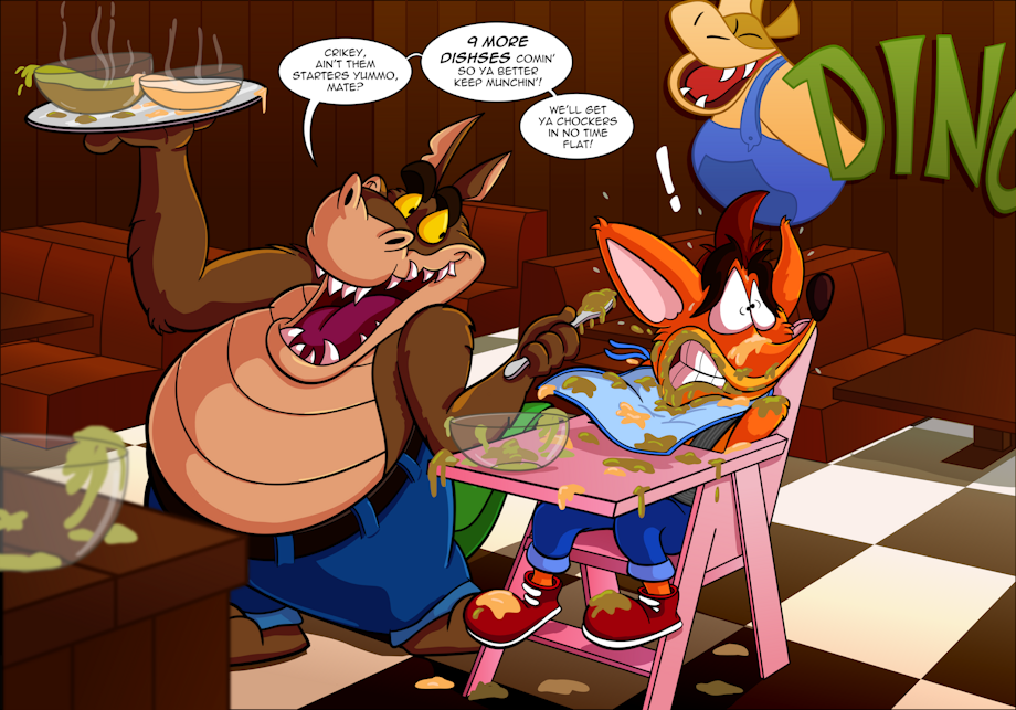 Crikey! Our fluffy, orange hero is in trouble again! But this time there will be no spinning, jumping or any other special moves involved - in fact, the only movement will be the one of his jaw going up and down as the generous host of "Dingo's Diner" keeps stuffing his mouth with all the "delectable dishes" served in the menu! The diner's guests always love the food so much they simply can't sit still! Thankfully Dingodile is well prepared for that and he's found a way to make sure they won't run awa-... I mean, they won't miss any bite of their mouthwatering feast! -----------------------------------------------------------------------------