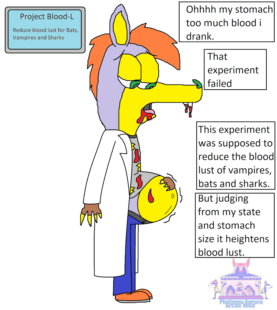 Professor B (Professor Blood) have been working on an experiment that reduces the blood lust of blood thirsty creatures mainly Vampires, Bats and Sharks but after a self test he wakes up with blood on his fangs, shirt and belly not only that but his tummy filled with blood and by the data he got this was a fail as it heightens blood lust instead of reducing it and now he must get back to work to make sure his experiment doesn't fail ever again