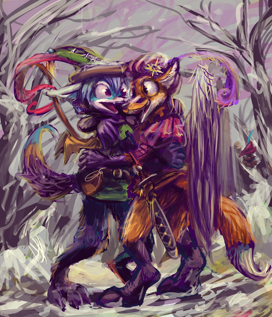 a commission-type drawing featuring balladaheart and hexensmartfox's characters hugging while wearing vaguely robin-hoodly outfits in a snowy environment