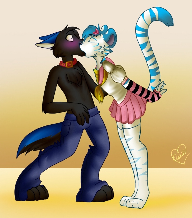 Crossdressing kitty giving a lil smooch to his wuffy <3