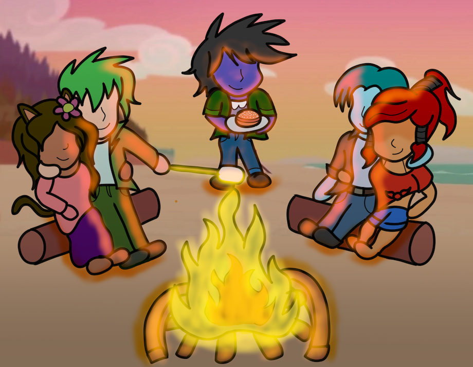 This is a drastic departure from my style since they're all chibi and small, but it came out pretty nice. I did use a screencap from EqG for the background but Seven said it was okay. It's Fluff, Seven Jefferson, Winter Sky and Victoria Heartsong sitting at the bonfire while Paladin Colt brings out a burger. :)