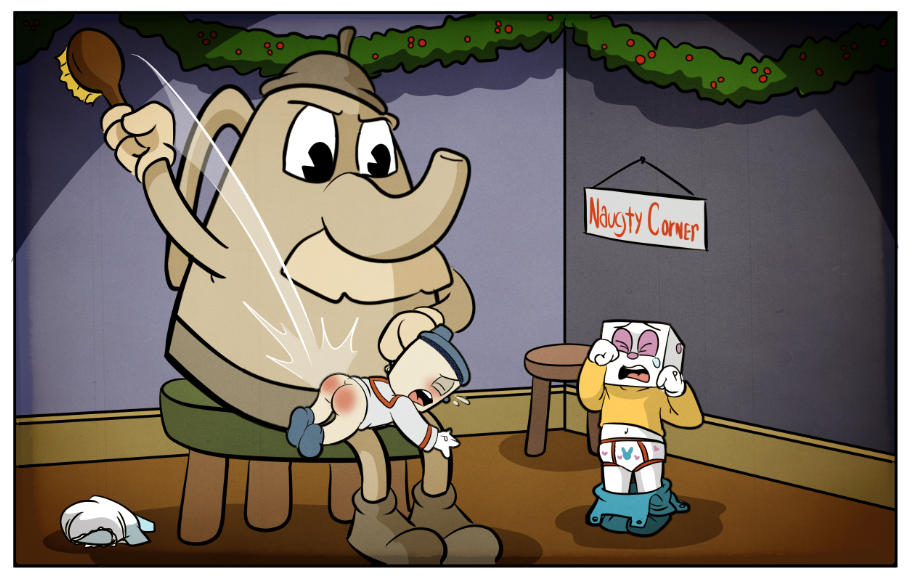 After catching Little Stein and Little Dice in the act of stealing candy canes he decided they needed stern correction. Usually something like that would warrant a stern lecture and some corner time, but since it was that kind of behavior that got them sentenced to regression in the first place it was decided that they would need a much more aggressive approach. Plus it didn't help that they destroyed two Christmas presents while executing their heist. So Elder Kettle grabbed his trusty hairbrush and led the boys to the corner of the room. He started with Little Stein by untapping his diaper and pulling him over his lap and instructing Little Dice to drop his pants because he was next. Elder Kettler then wore Little Stein's behind out while Little Dice stood by in his training pants waiting for his inevitable fate.