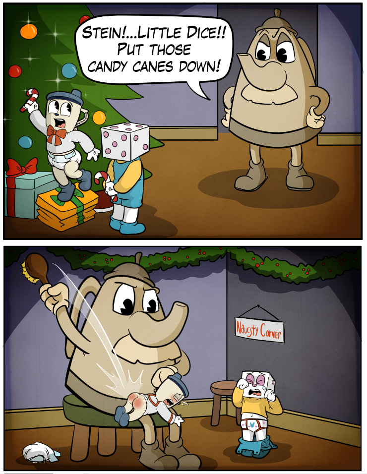 After catching Little Stein and Little Dice in the act of stealing candy canes he decided they needed stern correction. Usually something like that would warrant a stern lecture and some corner time, but since it was that kind of behavior that got them sentenced to regression in the first place it was decided that they would need a much more aggressive approach. Plus it didn't help that they destroyed two Christmas presents while executing their heist. So Elder Kettle grabbed his trusty hairbrush and led the boys to the corner of the room. He started with Little Stein by untapping his diaper and pulling him over his lap and instructing Little Dice to drop his pants because he was next. Elder Kettler then wore Little Stein's behind out while Little Dice stood by in his training pants waiting for his inevitable fate.