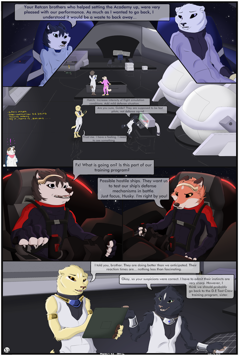 New page is done! I feel a bit bad that these are taking so long, but with this particular page I had some trouble. I had to come up with how the defense ships look inside, which was rather tricky. It didn't come out great, but let's just assume it looks rough because it's just the simulator capsule.