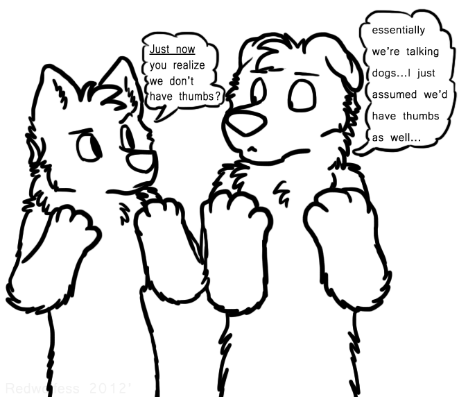 really, Beau? really? thumbs? don't be silly, talking dogs can't have thumbs, it's not realistic.