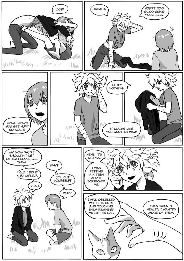 I get the serious tone and all, but I have to say that this page was cute at the end. Just how calm and rational he is about finding some remedy to his alienation by self-harm, then just getting embarrassed by having a friend who genuinely gives a damn about him and not calling him a freak for it. Always love those moments in stories because of how relatable it feels/how much people want to have that kind of thing happen.