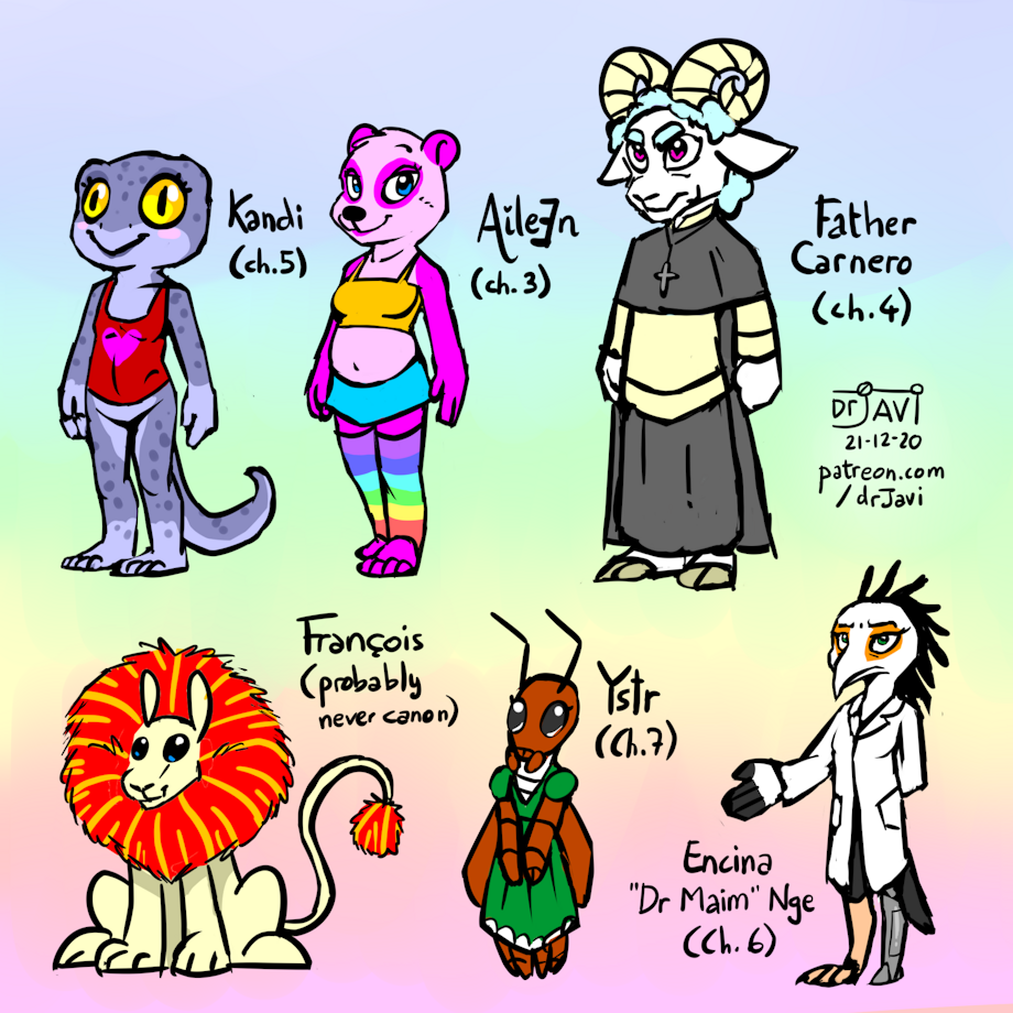 Some character designs for future chapters of my comic, doodle during Patreon art streams.