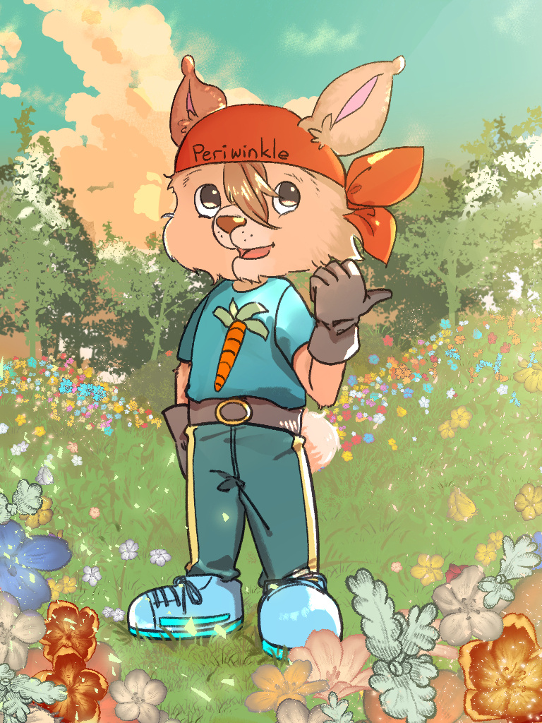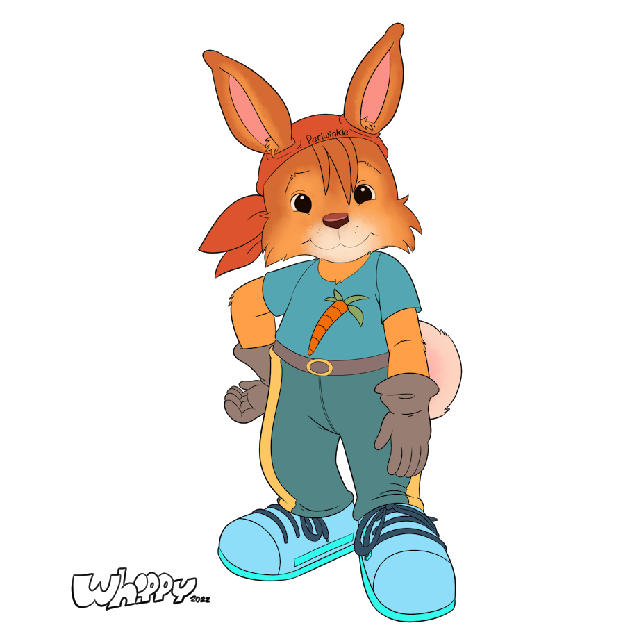 Periwinkle's outfit in the upcoming reboot novel project consists of vermillion bandana around his head with his name written on the center, a cerulean T-shirt with a picture of a carrot in the front, blue-green pants with golden-yellow vertical lines on each side, brown miner gloves, a brown belt around the waist with a gold buckle in the front, and sky blue sneakers with navy blue laces and lining.
