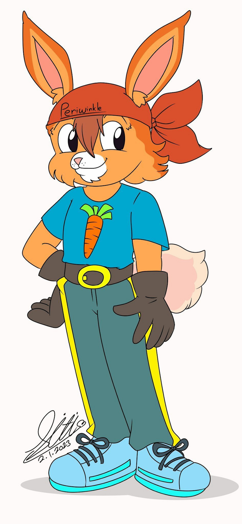 Periwinkle's outfit in the upcoming reboot novel project consists of vermillion bandana around his head with his name written on the center, a cerulean T-shirt with a picture of a carrot in the front, blue-green pants with golden-yellow vertical lines on each side, brown miner gloves, a brown belt around the waist with a gold buckle in the front, and sky blue sneakers with navy blue laces and lining.