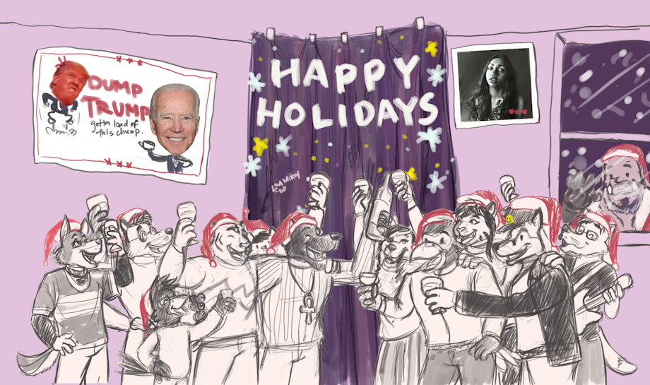 's Rigg as Santa in the window and a photo of Asha Puthli from 1969 on the wall.