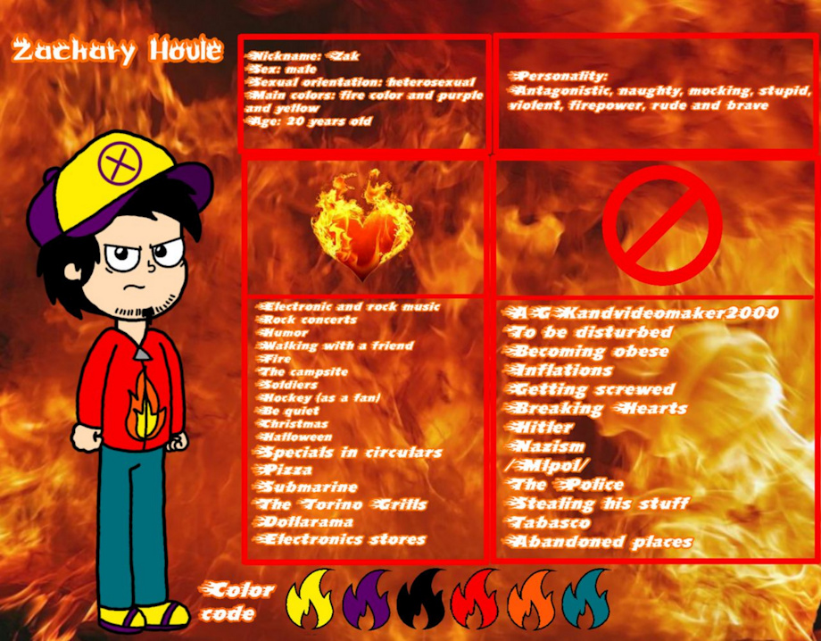 A purple and yellow curved cap with a circled purple X, beard and mustache, a red jacket with a fire symbol on it, turquoise pants and yellow and purple shoes.