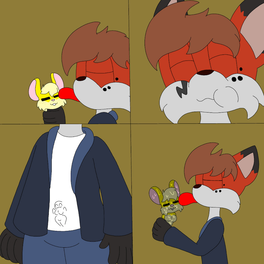 This is a picture my friend Shaowstar got drawn for us by theswaggah of his fursona OC Shadowstar the Fox and my fursona OC self me Fidel the Mouse just being our adorable selves, And after he licks and places me fully in his mouth and swallowing me whole .. and soon getting me back out .. safely and unharmed of course, ahehe looks like I'm getting a tongue bath, I loves it .. soooo adorably cute, I hope you like it. mm aheh =^//w//^=